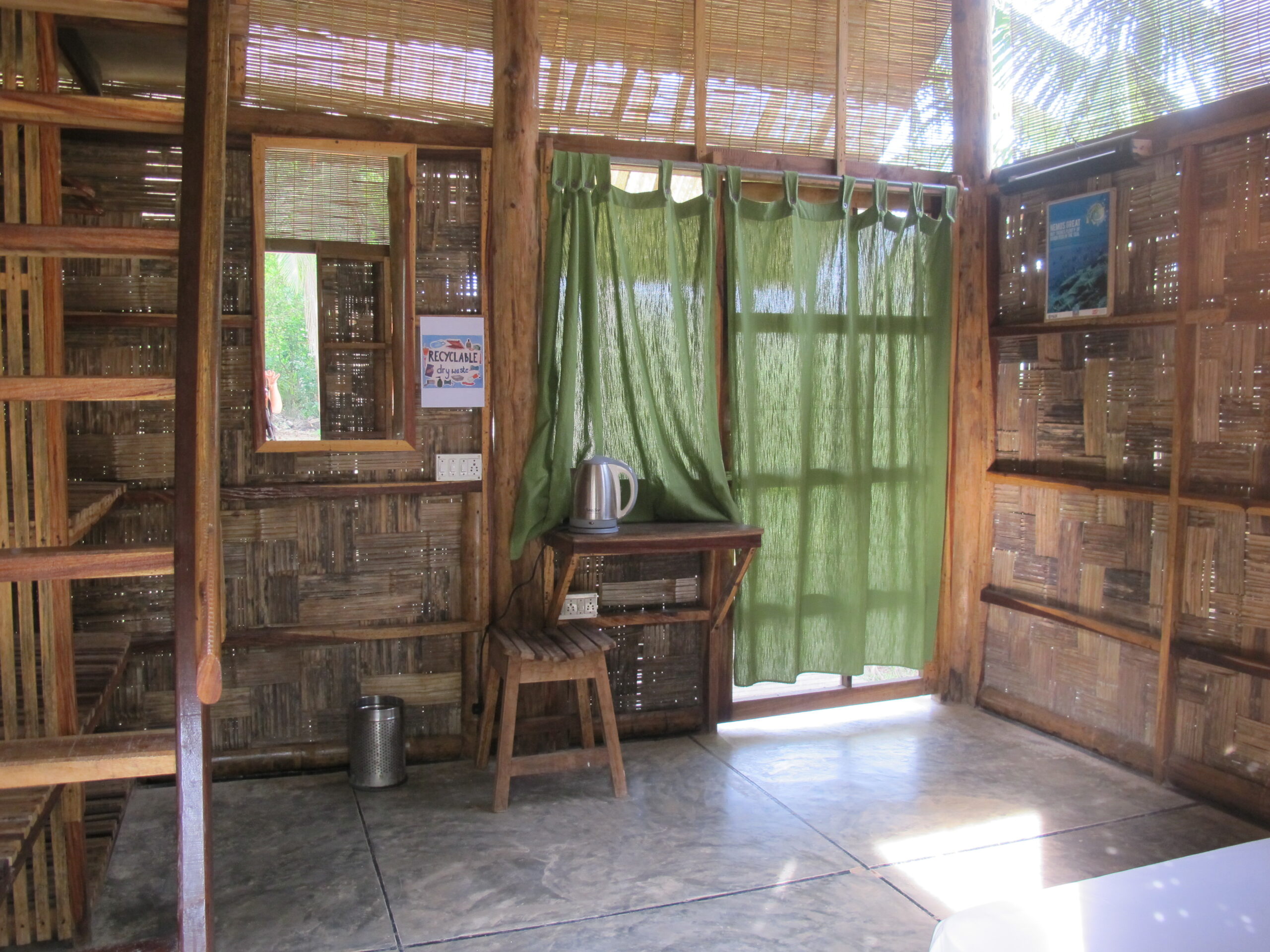 Emerald Gecko – Havelock was opened in 2005. A real eco-resort which was largely constructed with bamboo rafts which floated all the way from Myanmar! We offer simple beach living Robinson Crusoe style…no frills but with all the necessities such as mosquito net, ceiling fans, outlets for charging, hot water by bucket self-service at the hot-water boiler, free Reverse Osmosis drinking water refills. NO A/C, NO TV!!! Our carbon footprint is small…help to reduce plastic!!